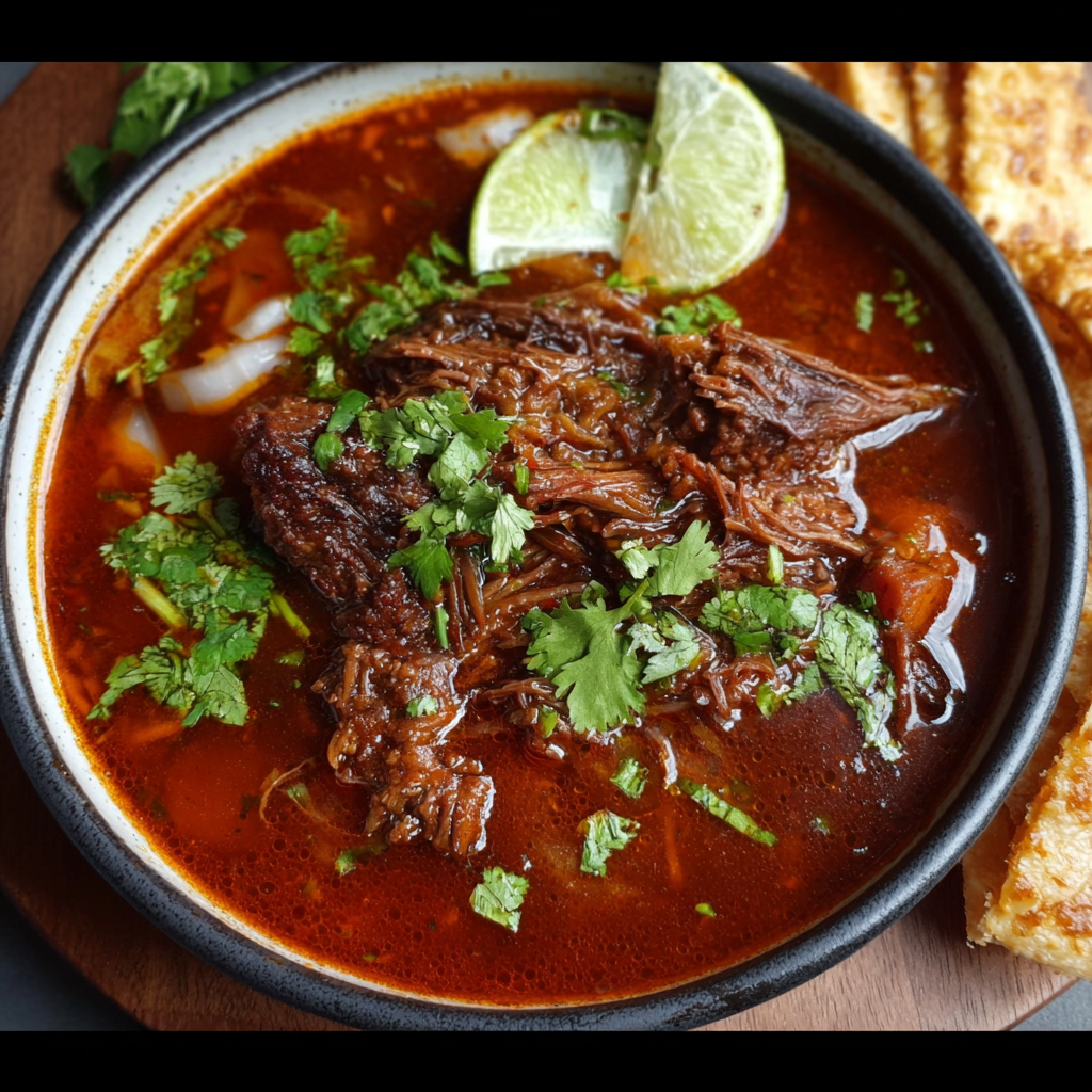Resumen: Estofado de res tradicional mexicano cocinado lentamente en un adobo de chiles guajillo y especias. Perfecto para tacos o consomé.
